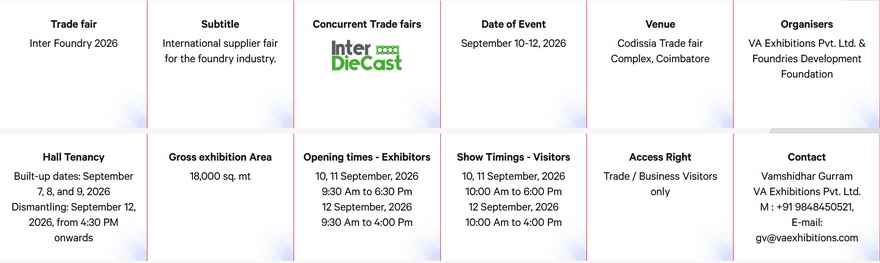 The upcoming edition of Inter Foundry will take place from September 10–12, 2026 at the Codissia Trade Fair Complex, Coimbatore, one of India's largest foundry clusters and a hub of industrial excellence. The event will also run alongside Inter DieCast, the international exhibition for die casting technologies, creating a powerful trade fair duo that represents the entire spectrum of foundry and die casting industries.