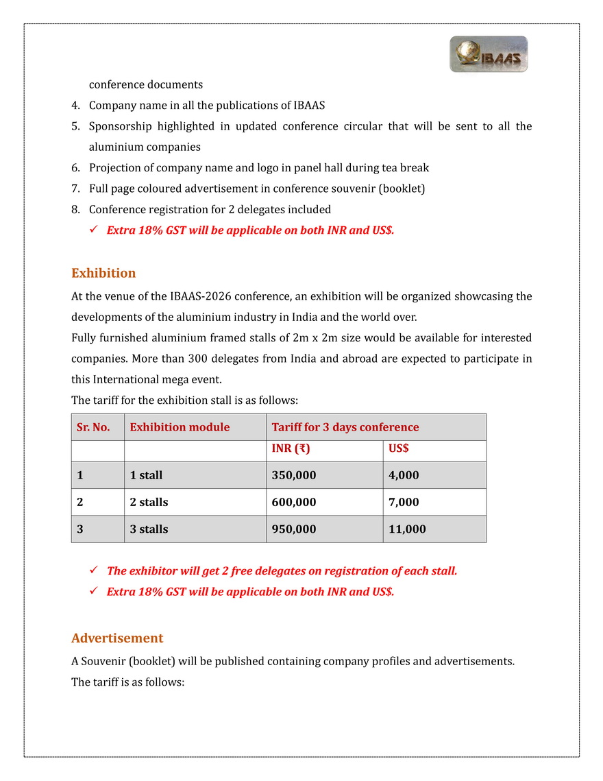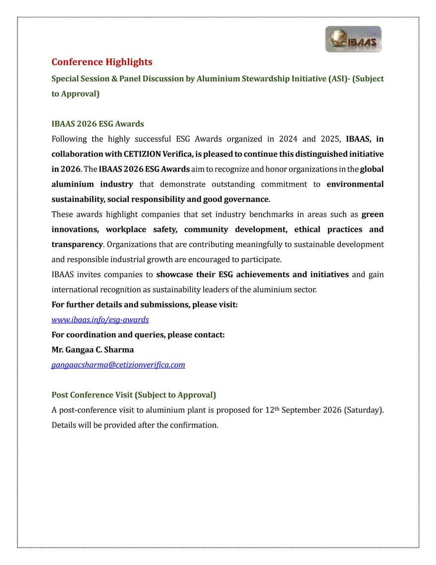 The three-day event will feature technical sessions, panel discussions, an international exhibition and B2B networking opportunities. IBAAS warmly invites stakeholders to join as delegates, paper presenters, exhibitors and sponsors and to be part of defining the next chapter of sustainable and competitive aluminium development.
