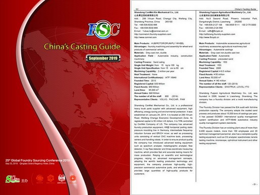 The China’s Casting Guide, edited in both Chinese and English, was an indispensable tool for the conference. The 201909 version, in addition to the basic information of the company participating in the casting supplier, also focuses on the foundry certification system, single weight range, single piece size, machining, heat treatment capacity, annual production, annual export value and other information which purchases interested in. It can quickly judge the comprehensive strength of the casting factory and is highly praised by the casting purchaser!